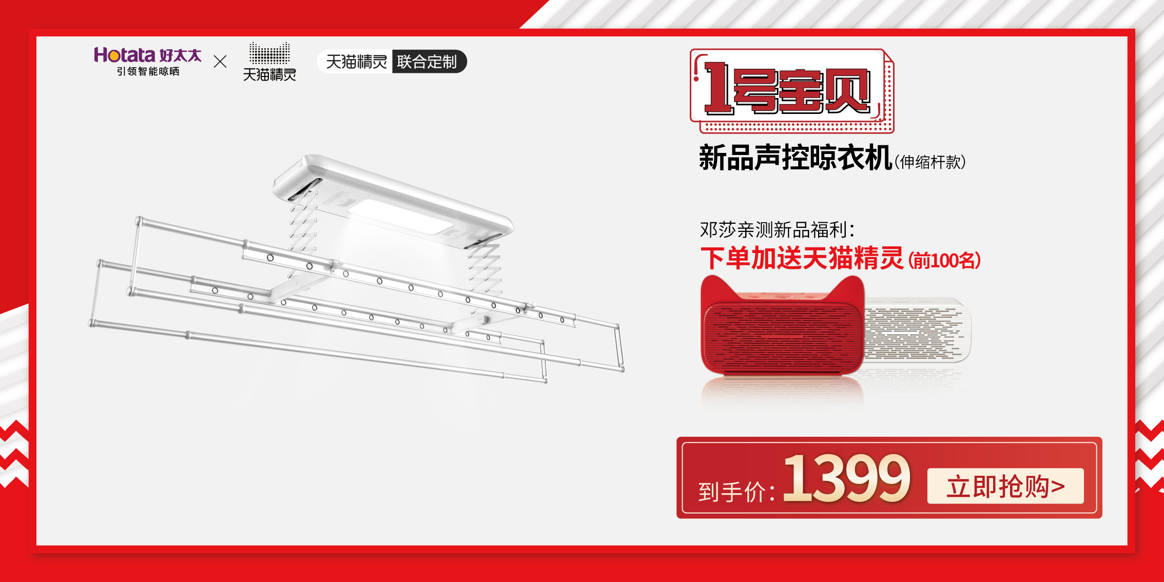 当好太太与天猫精灵强强联合,会为智能家居碰撞出怎样的新火花呢?让莎莎在直播间现场为大家亲测这款新品声控晾衣机,一起来八卦莎莎生活中都在用哪些好用的智能单品,一起get同款!直播现场下单邓莎亲测款新品声控晾衣机,还可以加送天猫精灵哦~