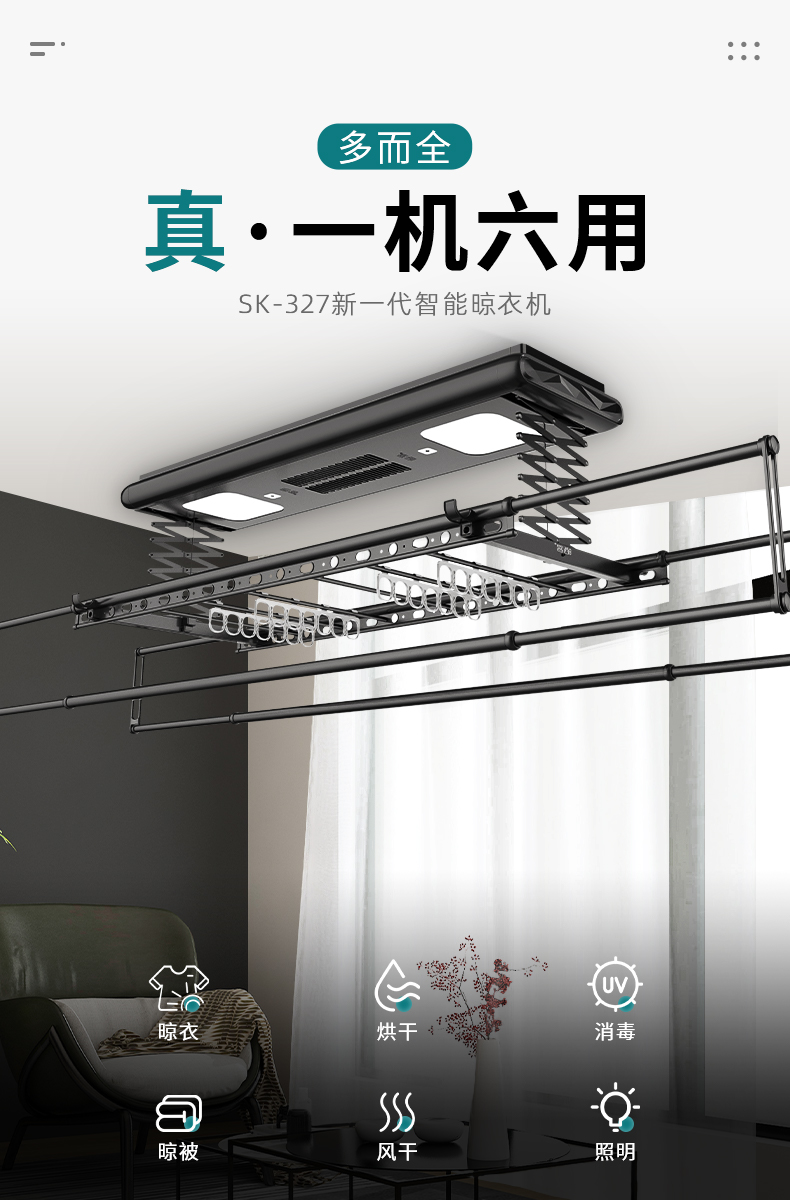 晒客SK-327配备伸缩晾杆,展开后晾衣杆长达2.2米即使是晾晒大件被履都毫无压力,同时配备小横杆和母婴夹等晾晒配件满足更多用户的晾晒需求。在外观设计上采用亮黑银配色,简约时尚符合年轻人喜爱的家装风格,透过新一代黑科技更是将晾衣机超薄做到极致,如选择内嵌式安装在晾衣机收拢后几乎与天花融为一体可完全体现它的超薄“隐形感”,是真正的集功能与颜值为一体的智能晾衣机。