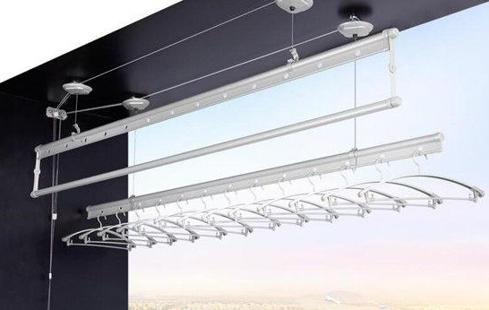 电动晾衣架:如果要安装多杆的电动晾衣架,阳台的宽度最好在1米以上,1米内能展开面积小了,晾晒效果就差一些。空高在3米以上(一般是双层的)这种需另外增加钢丝绳,同时需要自备高楼梯。公共晾晒区晾衣架图片。
